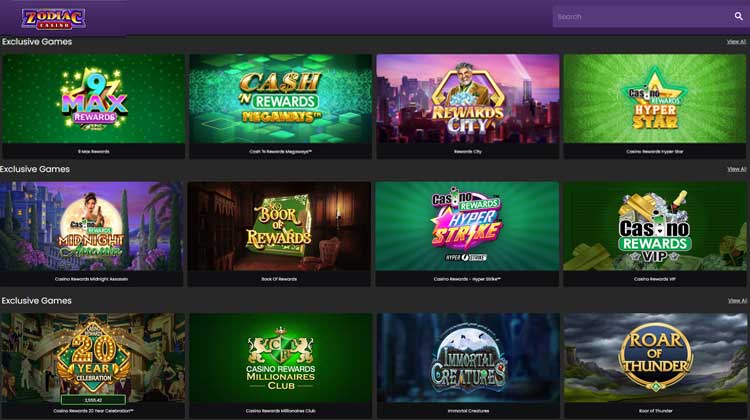 At Zodiac Casino you can find some exclusive slots that you can only play at one of the Casino Rewards propreties: 9 Max Rewards Epic Strike, Book of Rewards, Casino Rewards Millionaire Club, Casino Rewards VIP, Immortal Creatures, Rewards City, Roar of Thunder, Cash Rewards Megaways, Casino Rewards Hyper Star, Midnight Assassin, Casino Rewards Hyper Strike. Casino Rewards 20 Year Celebration and Casino Rewards Treasure Chest.